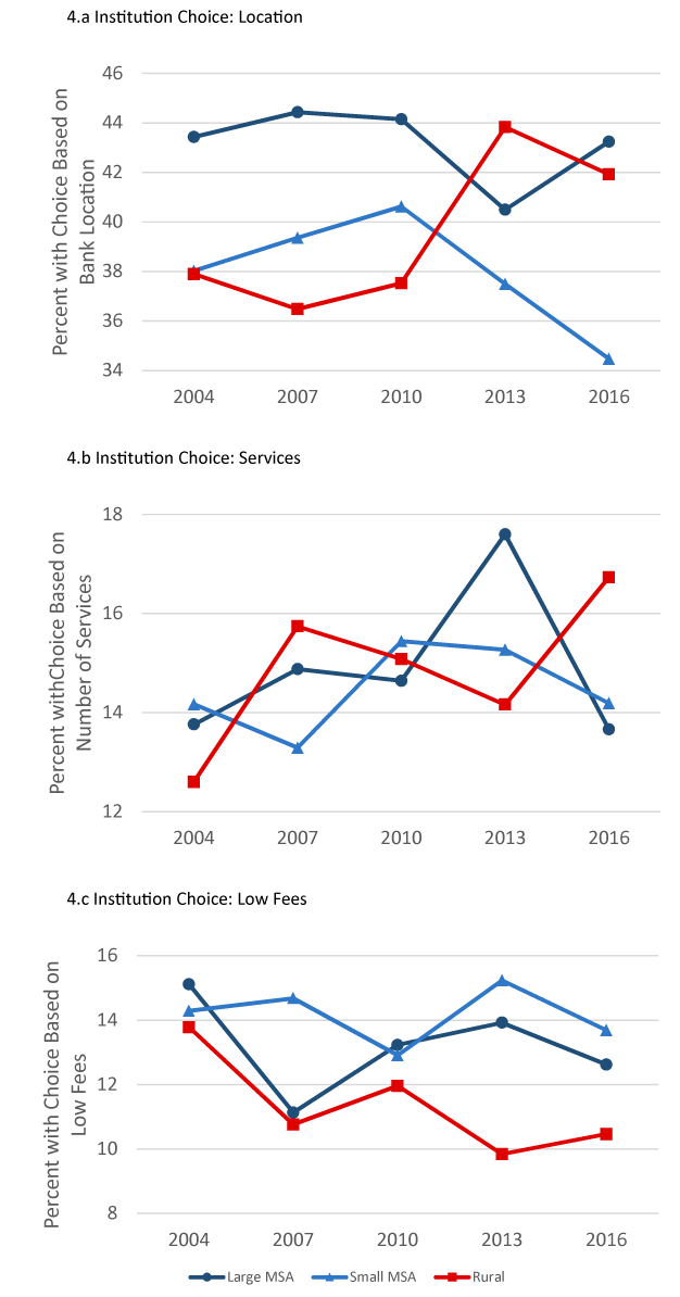 The fraction of rural households listing bank location as most important also increased by 4%. The proportion of rural households citing number of services as the reason for choosing their bank increased 4.1%, and the proportion citing fees as most important fell by -3.3%. In large MSAs, revealed preference for branch location and number of services services did not change from 2004-2016, while the fraction of households ranking fees as most important fell 2.5%. In small MSAs, revealed preference for branch location fell 3.6%. There are several possible interpretations of these trends, the most probable explanation being shifting demographics.