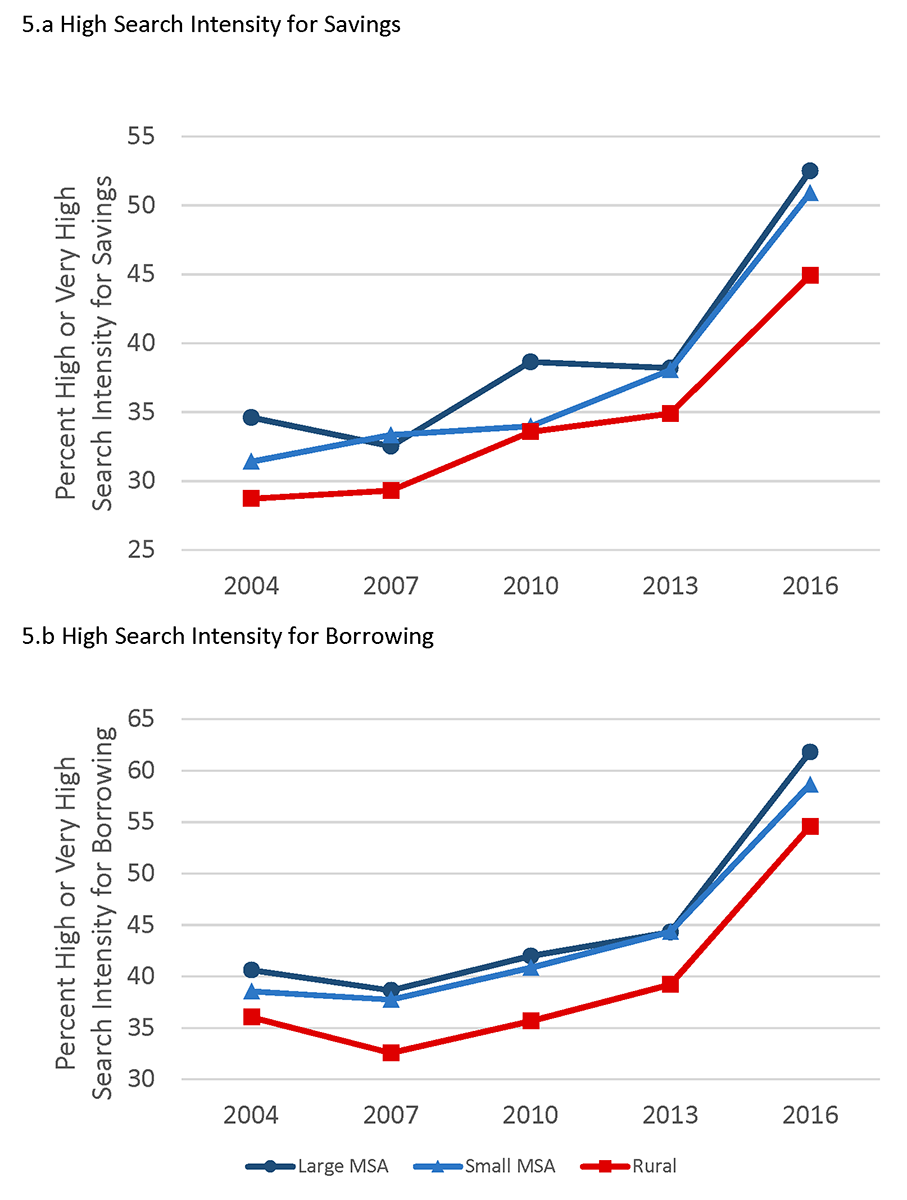 Figure 5 illustrates the evolution across survey waves of household intensity of search for good deals in savings (Figure 5a) and borrowing (Figure 5b). Search intensity in rural areas remained lower than search intensity in urban areas across all SCF waves. However, the overall fraction of households reporting "high" or "very high" search intensity for both borrowing and savings increased over 2004-2016. Search effort trended upward similarly in rural and urban areas for both borrowing and savings.