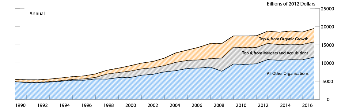 Real assets of the top four organizations grew from approximately $598.5 billion in 1990 to $7.9 trillion in 2016.3 Their share of industry assets increased from about 11 percent more than 40 percent over that period. The figure breaks out assets of organizations into those assets obtained through mergers and acquisitions and those from other sources (or "organic growth"). Clearly, mergers and acquisitions have played a significant role in the growth of these firms.
