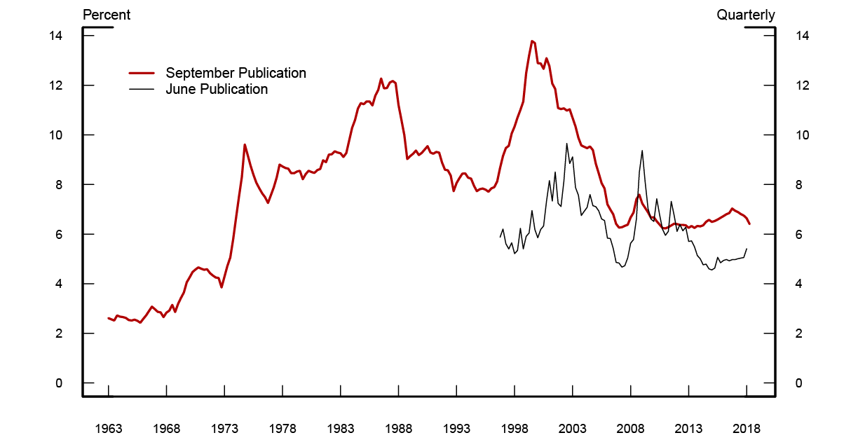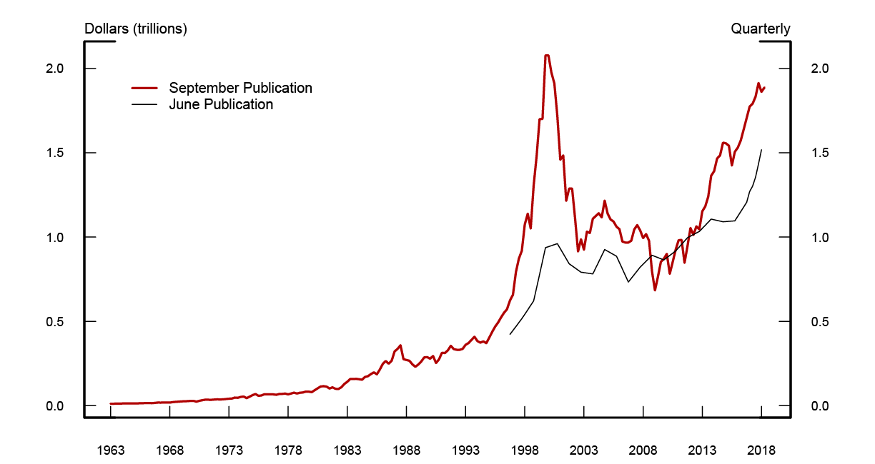 Figure 1 presents our new intercorporate equity holdings series and compares it to the series in previous publications. In addition, Figure 2 presents the corresponding series as a share of total equity outstanding. There are four key takeaways from these figures. First, the new series extends back much further historically. Second, intercorporate holdings are large. These holdings represent 8% of total equity outstanding on average with shares peaking around 14% in 2002. Third, on average the new series has been revised upward, reflecting our accounting for additional equity holdings not reported in IVAEQ. Finally our new intercorporate holdings series better captures market fluctuations. For example, Figure 1 shows that the value of intercorporate holdings increased and fell rapidly during the dotcom boom and bust, consistent with the overall market. More recently, Figure 2 shows that our previous series implied a decrease in intercorporate equity holdings relative to total equity outstanding from 2013-2018. After accounting for the rise in market to book value over this period we instead see that this ratio is relatively unchanged over the past 5 years.