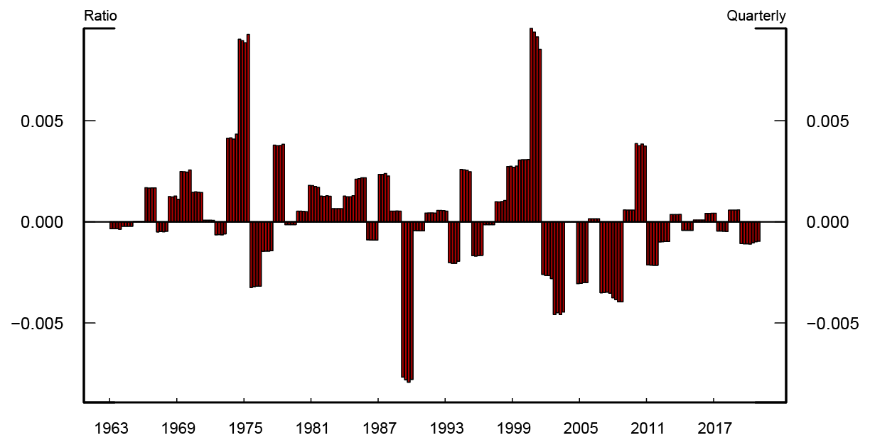 Figures 3 and 4 present corresponding figures for the new net transaction series, with Figure 3 presenting the level of changes and Figure 4 presenting changes relative to total equity outstanding. We observe that net investment, both on an absolute and relative basis, peaked in 1999. In contrast, net investment bottomed on a relative basis in 1988 and an absolute basis in 2006. Net transactions have been modest post-crisis, although net transactions ticked down in 2017.
