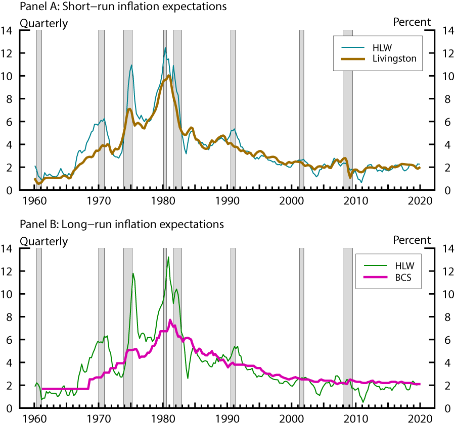 Two inflation expectation measures play an important role in the HLW model. First, the trend inflation term, $$\pi^*_t$$, appearing in the Phillips curve equation (3), affects our inference about the unobserved output gap based on realized inflation. Similarly, in the IS equation (1), the 1-quarter ahead expected inflation, $$E_t \pi_{t+1}$$, by affecting the measurement of the ex-ante real rate $$r_t$$ according to Equation (5), influences the inference regarding the dynamics of the real rate gap for a given history of output gap and nominal short rates. These observations suggest that model estimates of $$r^*_t$$ may be crucially influenced by how we measure or proxy those two inflation expectations terms.