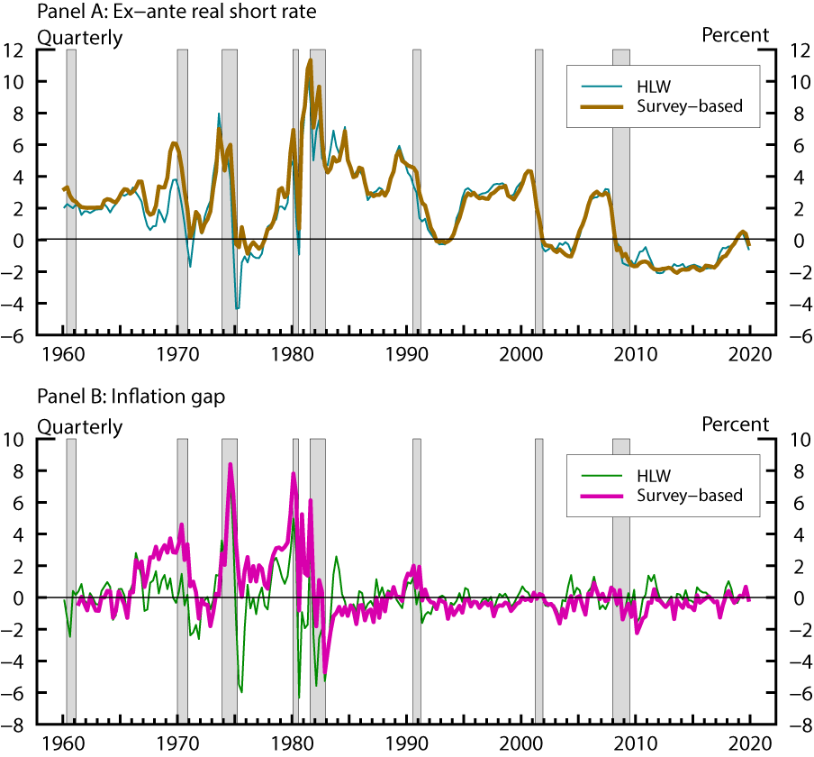 The two inflation gap measures, shown in the bottom panel of Figure 3, are constructed as the difference between observed core CPI inflation and either measure of trend inflation, shown in the bottom panel of Figure 2. The volatilities of, and the correlation between, the two measures changed notably around the late 80s and early 90s. The first part of the sample witnessed substantial disparities between the two inflation gap measures. The survey-based measure was positive late in the 60s and spiked twice in the 70s, as actual price increases outpaced survey inflation expectations. In contrast, the HLW measure took both positive and negative values during the 1970s, falling sharply in the aftermath of the first oil shock and staying systematically below the survey-based measure. Subsequently, the Great Moderation period—especially if considered as having started in the early 90s—muted the volatility of both measures. The two measures became highly correlated, albeit the survey-based measure tends to run slightly below the HLW measure—particularly during the aftermath of the global financial crisis, when inflation systematically undershot the FOMC's 2 percent objective but survey inflation expectations held surprisingly stable. The correlation between the two inflation gap series, at about 0.6 over the full sample, is much lower than that of the ex-ante real short rates.