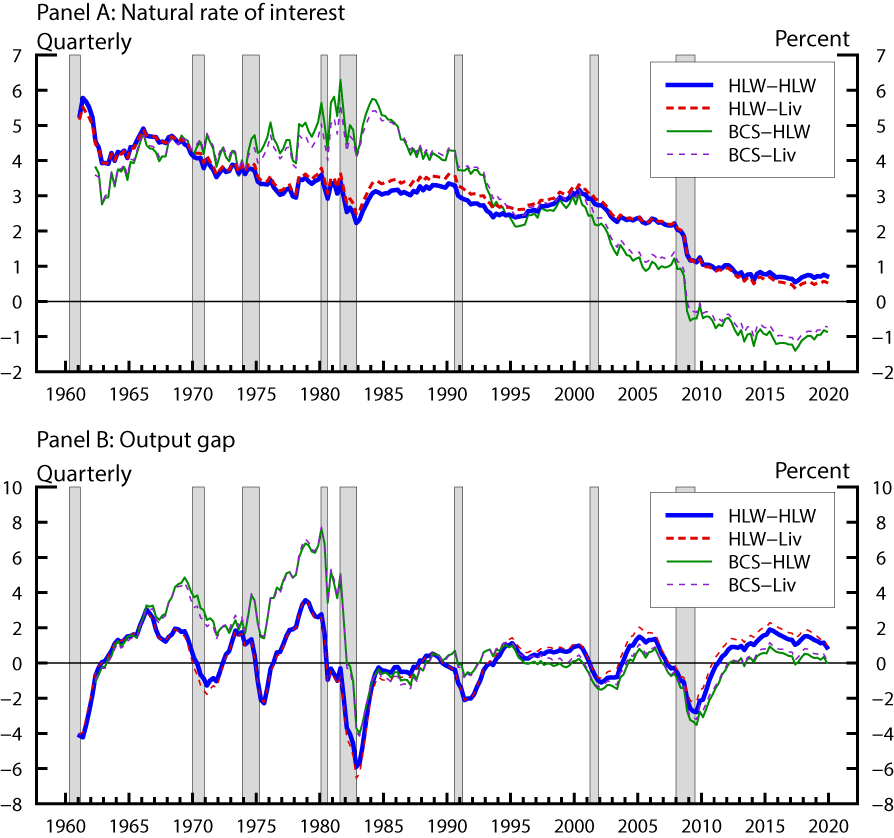 Panel B plots the resulting estimates of $$r^*_t$$ from the HLW model using core PCE and core CPI inflation, respectively.2 Despite some small differences in particular time periods, the variations of the two series are quite similar over the entire sample.3