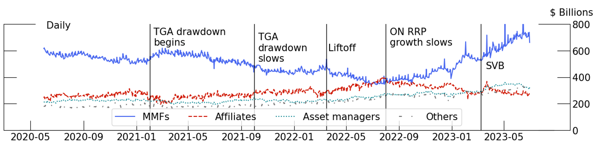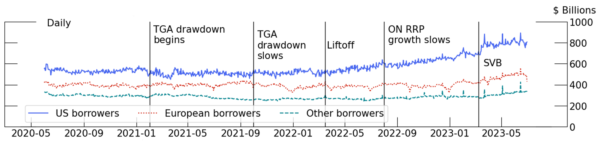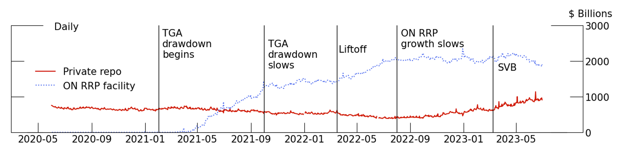 Note: Drop line dates are as follows: "TGA drawdown begins" is February 1, 2021. "TGA drawdown slows" is October 1, 2021. "Liftoff" is March 17, 2022. "ON RRP growth slows" is August 1, 2022. "SVB" is March 9, 2023.