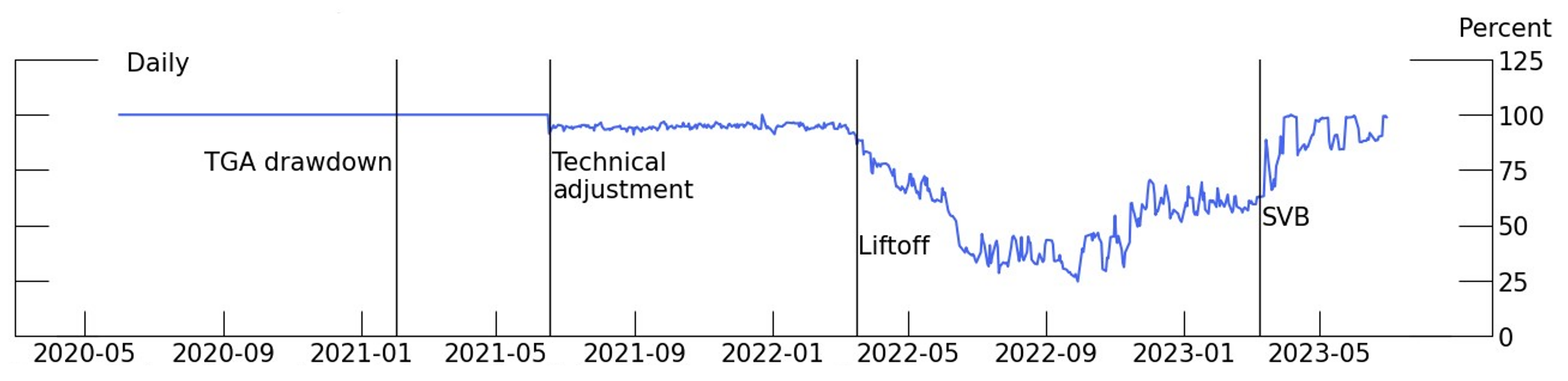 Note: Drop line dates are as follows: "TGA drawdown" is February 1, 2021. "Technical adjustment" is June 17, 2021. "Liftoff" is March 17, 2022. "SVB" is March 9, 2023.