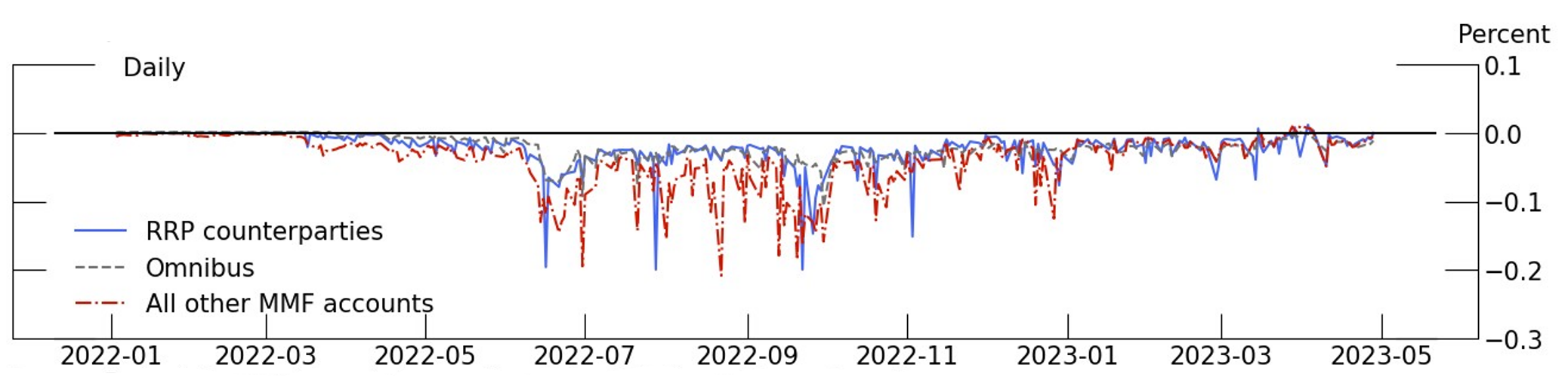 For some MMFs, the answer might be simple: They do not have access to the facility. However, as we show in Figure 3, lack of access to the ON RRP facility only explains part of the puzzle. We plot weighted average spreads for MMF investments in private repo relative to the ON RRP rate. Private repo rates earned by money market funds are similar for those with access to the ON RRP facility (so-called "reverse repo counterparties" or "RCPs"), those without access (non-RCPs), and omnibus accounts (largely family-level accounts that may mix RCPs and non-RCPs). While RCPs and omnibus accounts received slightly higher rates than non-RCPs over parts of the sample, average rates received by all types of MMFs fell short of the ON RRP rate, so lack of access to the facility does not appear to be driving transactions at rates below the ON RRP rate.6