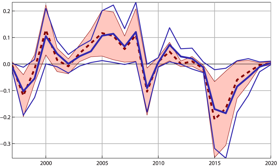 4. The idiosyncratic pass-through estimated for the US shown in Figure 1 is, indeed, statistically different from zero, both one month, and two months after the shock. Note, however, that this result is not robust, as the estimated pass-through is not statistically different from zero when the model is estimated on a longer sample (see the working paper version of this note). For this reason we state that "the estimated pass-through into the idiosyncratic component is not statistically different from zero". Return to text