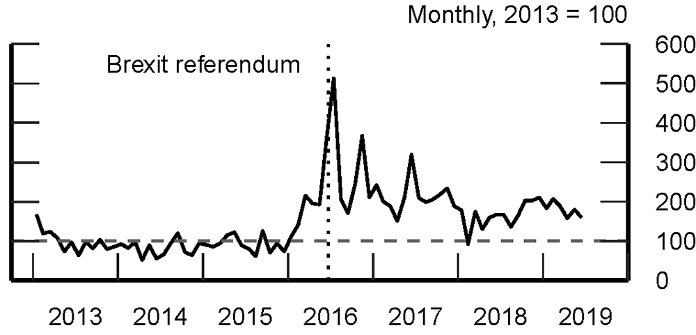 In the historic Brexit referendum on June 23, 2016, U.K. citizens voted in favor of leaving the European Union (EU), a result that created substantial uncertainty regarding the future economic relationship between the United Kingdom and the EU. As can be seen in Figure 1, uncertainty, measured by the Economic and Policy Uncertainty (EPU) index of Baker et al. (2016), spiked around the Brexit referendum date and has remained elevated relative to its pre-referendum level since then. Although the United Kingdom remained a member of the EU until January 31 2020, U.K. economic activity has slowed substantially since the referendum. This makes the Brexit episode an opportunity for an interesting case study of how shifting expectations and increased and persistent uncertainty about the future course of policy can affect an economy even before the actual change in policy occurs.