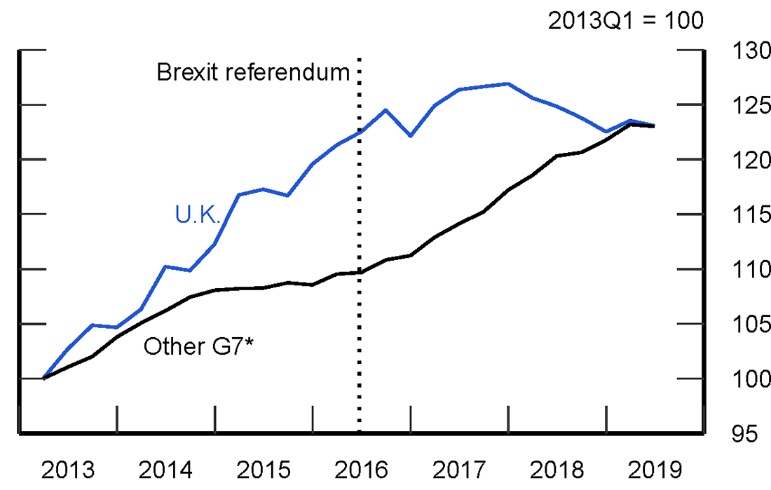 As can be seen in panel a of Figure 2, U.K. real GDP growth has slowed down somewhat (by around 0.7 percentage points at an annualized rate) between the 2016 vote and the first half of 2019, relative to the three-year period preceding the referendum. Moreover, U.K. growth was generally among the highest within the G7 countries in the years before the Brexit referendum, but has since fallen towards the bottom half of the G7 ranking. Panel b of Figure 2 shows that, had U.K. growth maintained its historical relationship with the other G7 countries, the level of U.K. real GDP would have been 2.2 percent higher as of mid-2019. One could interpret this difference as representing the GDP loss due to U.K.-specific factors since the referendum.