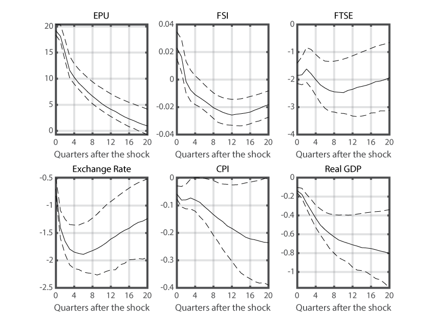 In Figure 5, we show the impulse responses to a one standard deviation shock to the U.K. EPU measure (dashed lines represent one standard deviation confidence interval). An increase in EPU leads to an increase in the financial stress index (tighter financial conditions) in the short run, a decline in the stock market index, and a depreciation of the pound on a trade-weighted basis. These channels lead to a decline in inflation and real GDP.