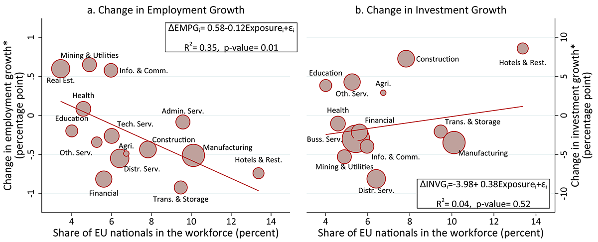 Panel a of Figure 9 displays the negative and strong relationship since the Brexit referendum between the change in industry employment growth and EU exposure through the workforce, which is defined as the proportion of EU nationals in the workforce of an industry.10 Specifically, industries with a larger pre-referendum share of EU nationals in the workforce experienced a larger slowdown in their employment growth rates after the referendum.11 In contrast, when we consider the change in investment growth, the relationship becomes positive, but statistically insignificant, suggesting that firms' concerns over the post-Brexit labor market have not been a factor affecting their investment decisions (panel b of Figure 9).