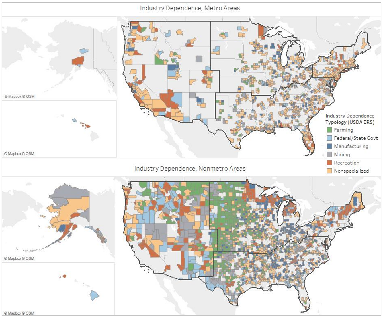 Table 3 shows how nonmetro counties have much higher rates of industry dependence, regardless of region. It also shows how the industry that nonmetro counties are dependent on differs by Census region. For example, a much larger share of nonmetro counties in the Midwest are dependent on farming than in other regions, whereby a much larger share of nonmetro counties in the Northeast are dependent on recreation than in other regions. A disproportionately large share of nonmetro counties in the Midwest and South are manufacturing dependent relative to the Northeast and West. Lastly, the South and West have a large share of nonmetro counties that are dependent on the mining industry relative to the Northeast and Midwest.