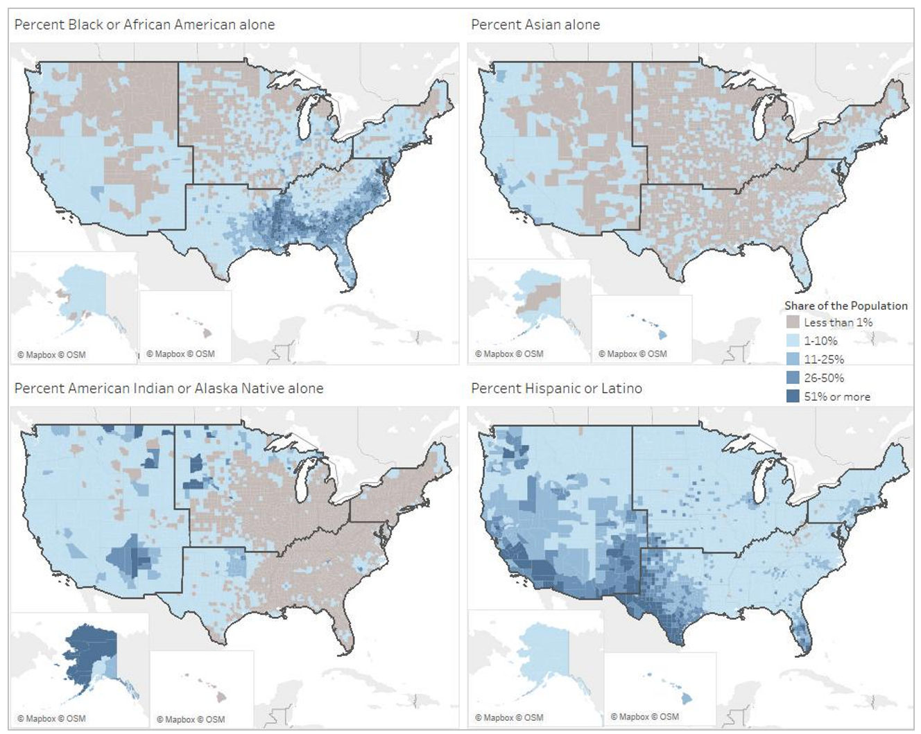 Similar to the way industries tend to cluster in certain locations, the presence of particular racial or ethnic populations is not evenly distributed across the country. Figure 2 shows how counties with a large share of the population that are Black or African American are concentrated in the Southeast. Counties with large shares of the population that are Asian American are concentrated in the West. Counties with large population shares of American Indians or Alaska Natives are in the South, West, Great Plains, and Alaska. Counties with large shares of the population that are Hispanic or Latino are concentrated in the South and West, with pockets elsewhere.