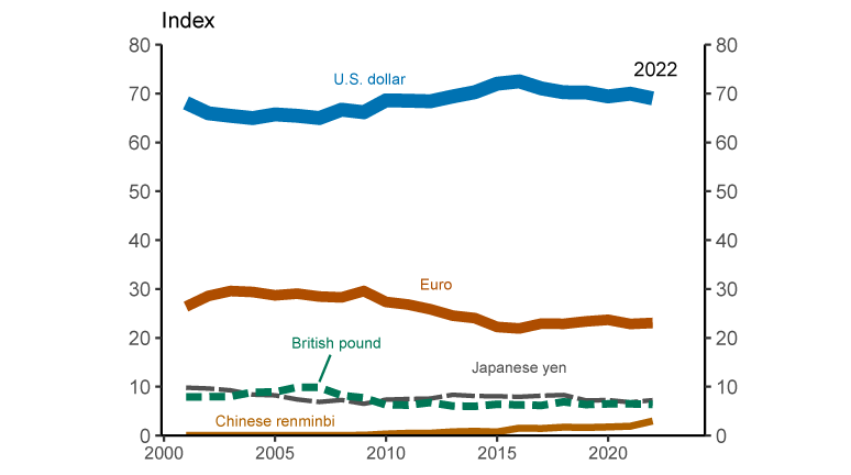 A review of the use of the dollar globally over the last two decades suggests a dominant and relatively stable role. To illustrate this stability, we construct an aggregate index of international currency usage. This index is computed as the weighted average of five measures of currency usage for which time series data are available: Official currency reserves, FX transaction volume, foreign currency debt instruments outstanding, cross-border deposits, and cross-border loans. We display this index of international currency usage in Figure 10. The dollar index level has remained stable at a value of about 70 since 2010, well ahead of all other currencies. The euro has the next-highest value at about 23, and its value has remained fairly stable as well. While international usage of the Chinese renminbi has increased over the past 20 years, it has only reached an index level of about 3, remaining even behind the Japanese yen and British pound, which are at about 7 and 6, respectively.
