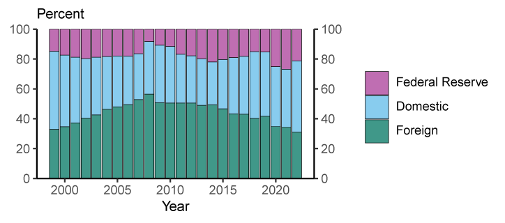 The bulk of these official dollar reserves are held in the form of U.S. Treasury securities, which are in high demand by both official and private foreign investors. As of the end of 2022, $7.4 trillion or 31 percent of marketable Treasury securities outstanding were held by foreign investors, both official and private (see Figure 3a), while 48 percent were held by private domestic investors, and 21 percent by the Federal Reserve System. Although the share of Treasuries held by foreign investors has declined from almost 50 percent in 2014, the current foreign share of Treasury holdings is broadly comparable to the foreign-held shares in the euro area, Japan, and the United Kingdom (shown in Figure 3b).