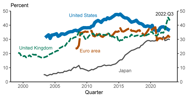 Source: Financial Accounts of the United States, Table L.210. BIS debt securities statistics; World Bank/IMF Quarterly External Debt Statistics (QEDS), accessed through Haver Analytics; Bank of England; Bank of Japan; European Central Bank; Federal Reserve Board; Board staff calculations.