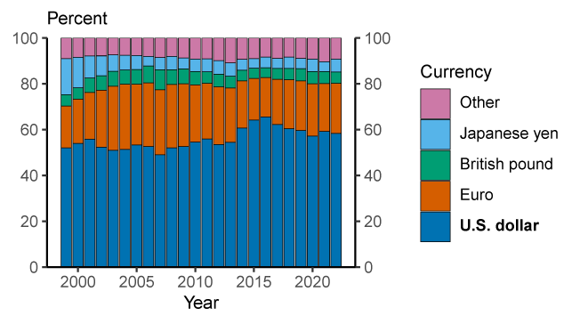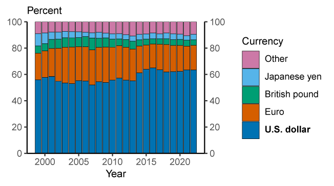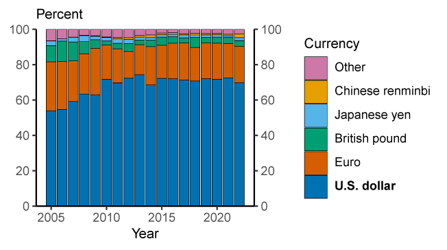 5. The U.S. dollar is also the most commonly used currency for cross-border payments via SWIFT, accounting for over 40% of payments (see Chart 2 in The International Role of the Euro June 2022 published by the European Central Bank https://www.ecb.europa.eu/pub/pdf/ire/ecb.ire202206~6f3ddeab26.en.pdf ). This figure would be even higher if inter-euro area payments were excluded. Return to text