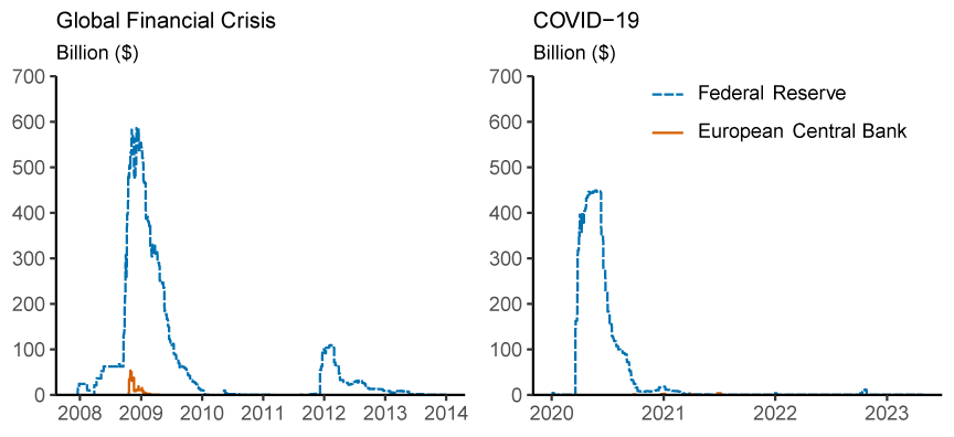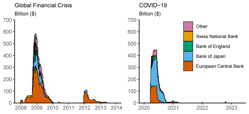 Note: In Figure 7a legend entries appear in graph order from top to bottom. Federal reserve swap line provisions to the Bank of England, Bank of Japan, and other central are at or near 0 prior to September 2008. Provisions to the Swiss National Bank are at or near 0 prior to March 2008. Provisions for the Swiss National Bank and Bank of England are at or near zero after June 2009. Figure 7b includes both swap line and repo provisions by the European Central Bank for the COVID-19 period. At current exchange rates. Data are daily and extend from December 1, 2007 through December 31, 2013 for the Global Financial Crisis, and January 1, 2020 through April 30, 2023 for the COVID-19 period. Swap line provisions for the European Central Bank are 0 (or near 0 when shown in billions) before October 2008 and after February 2009.