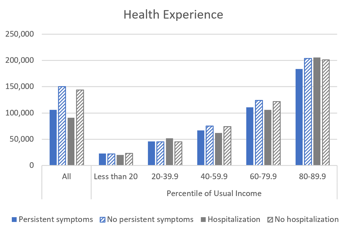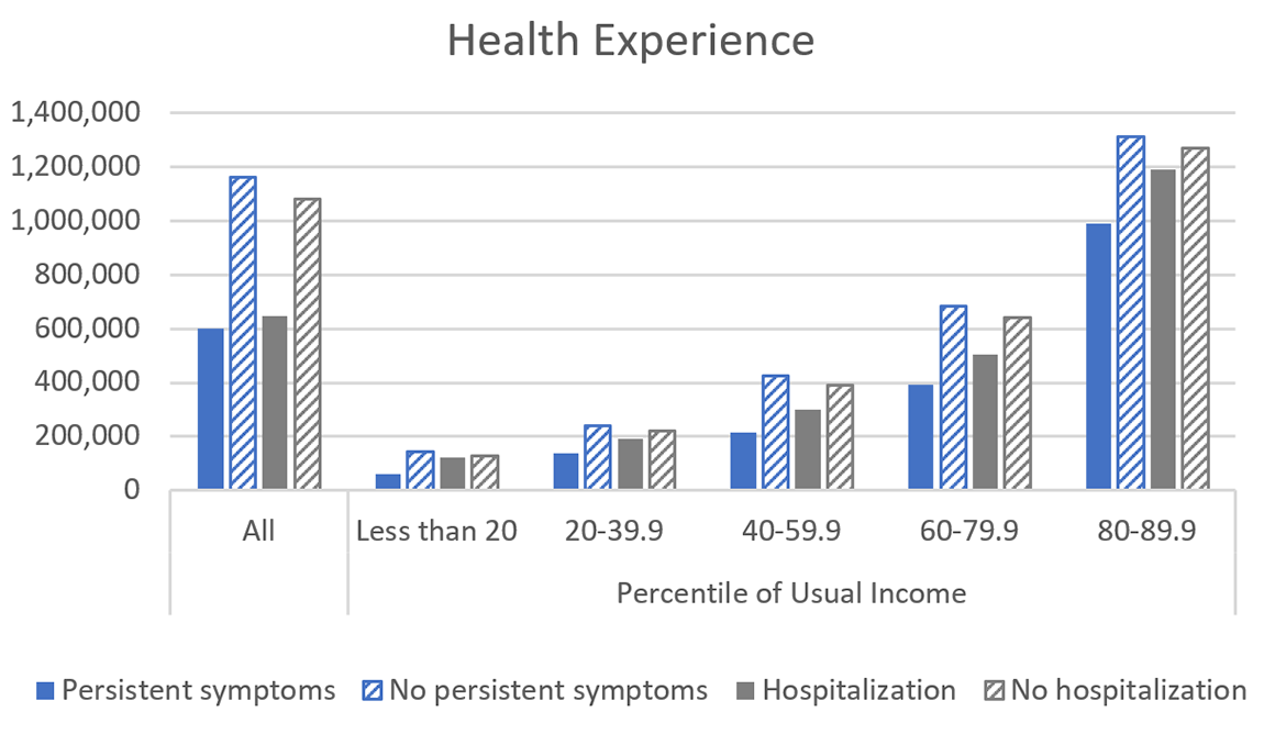 23. For the measure based on persistent symptoms, the difference is again largest in the bottom quintile, but for the hospitalization measure, the difference is largest in the middle quintile. The differences across the distribution for the measure based on persistent symptoms were generally slightly larger than those from the comparison between decreased employment and the baseline employment group. Return to text
