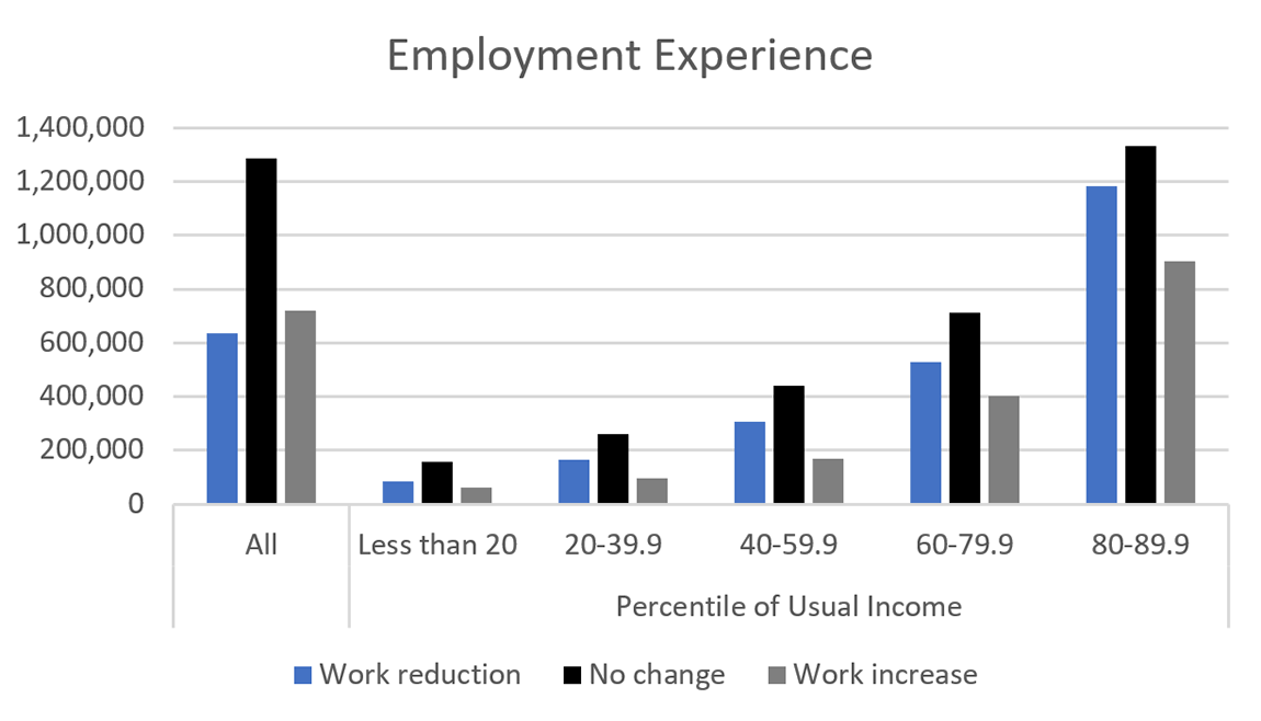 5. This characterization is based on the first option that the respondent selected for themselves and, if applicable, their spouse or partner (although including the second option does not materially affect conclusions). Reduced hours, a job or business loss, and entry into retirement are classified as a "work reduction;" increased hours and a new job or business are classified as a "work increase;" and continuing to report (either in-person or via telework) and continuing to be unemployed or out of the labor force are classified as "no change." Less than 2 percent of families in any group reported changes in opposite directions between the respondent and their spouse or partner, and these families are included in the "no change" category. Return to text