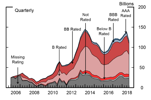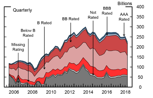 Although by definition BL and HYB MFs invest primarily in below investment grade debt, in this section we use MD credit rating variables to decompose BL and HYB MF fixed income and cash allocations in terms of their credit quality.7 Figures 2 and 3 display the breakdown of assets by specific credit ratings.8 In both BL and HYB MFs, the largest credit category correspond to B rated securities, representing about 42 and 32 percent, respectively. For BL MFs, these percentages account to about $27 billion in assets at end-of-year 2018, while for HYB MFs, B rated allocations are close to $25 billion. Overall, at the end of 2018, BL and HY funds held 74% and 71%, respectively, of their rated assets in securities with a credit rating of B and below.