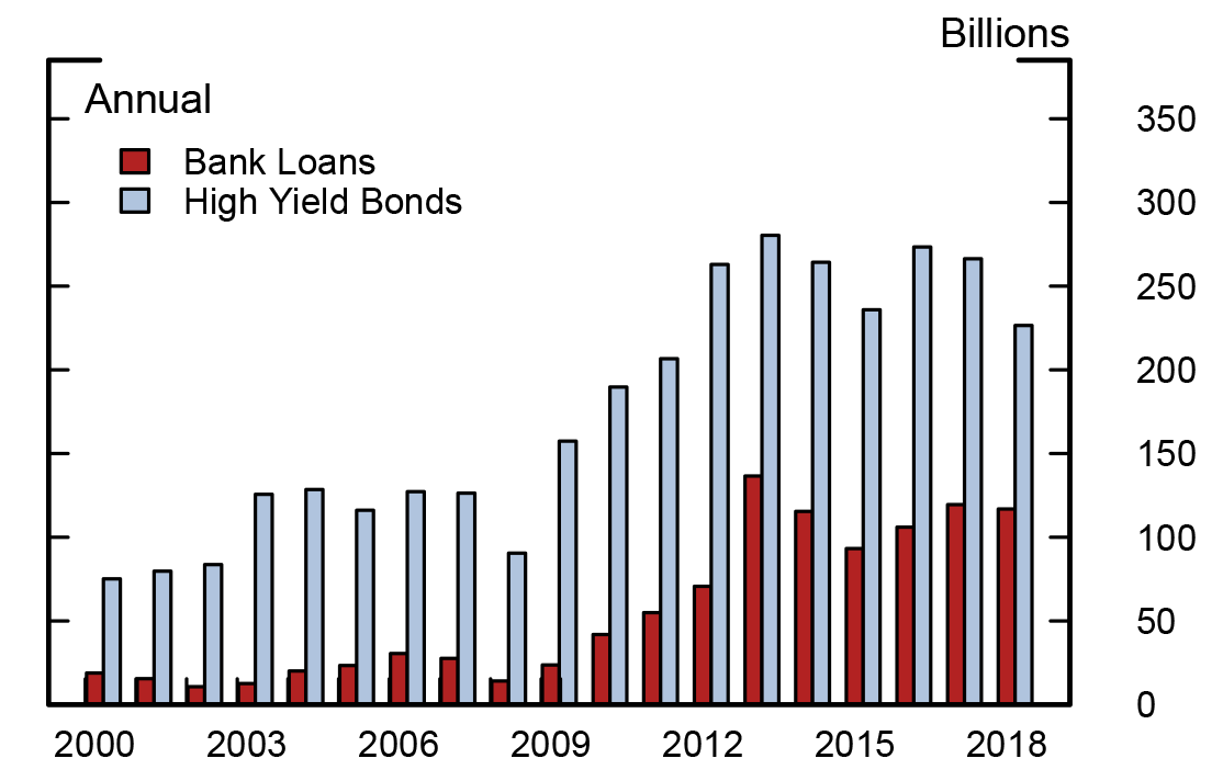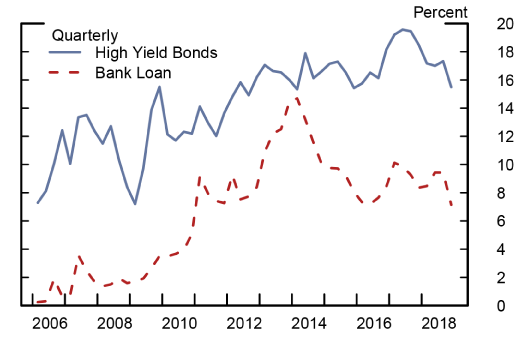 - BL and HYB MFs' respective market share of leverage loans (LL) and high yield (HY) corporate bonds outstanding increased since the mid-2000s. BL MFs reached a 15 percent peak in 2013 and since has fluctuated around 7 and 10 percent. Meanwhile, HYB MFs' market share consistently increased since the mid-2000s, reaching about 16 percent at the end of 2018.
