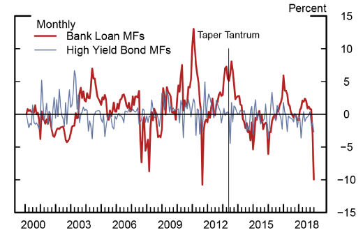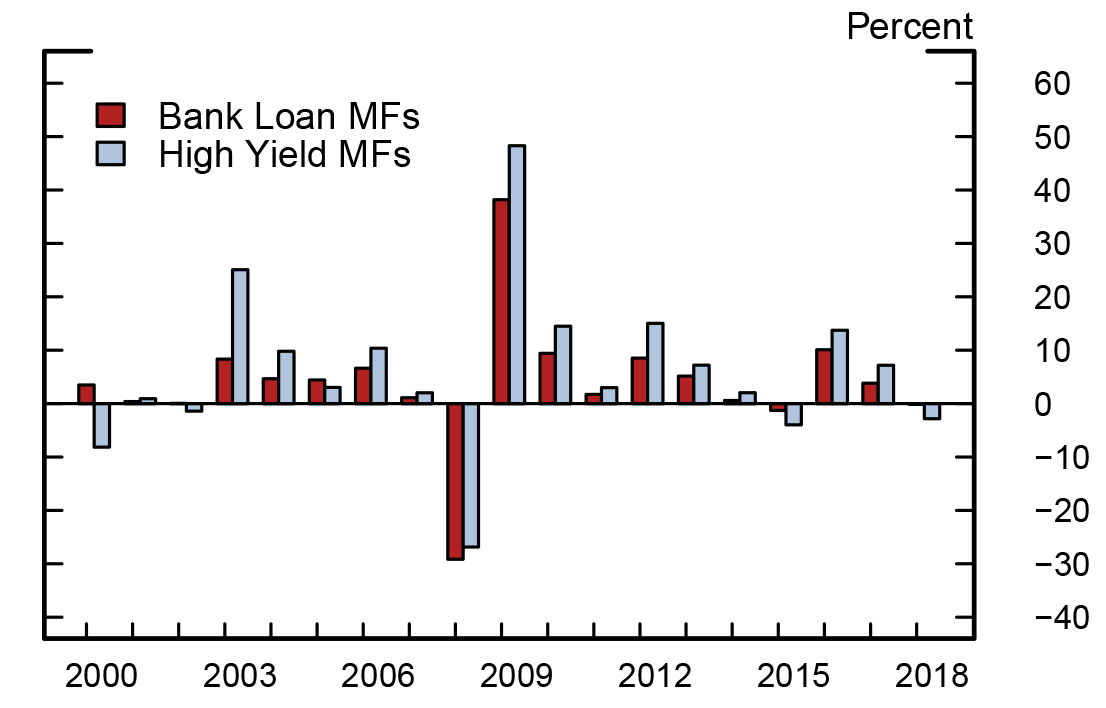 9. For BL, these estimates are computed as the share of leveraged loans in BL MFs relative to the total assets of institutional leverage loans outstanding reported by S&P/LSTA by way of Thomson Reuters. A similar approach is applied to estimate the share of HY securities held by HYB MFs, where total HY corporate bond outstanding is from Mergent's FISD. Return to text