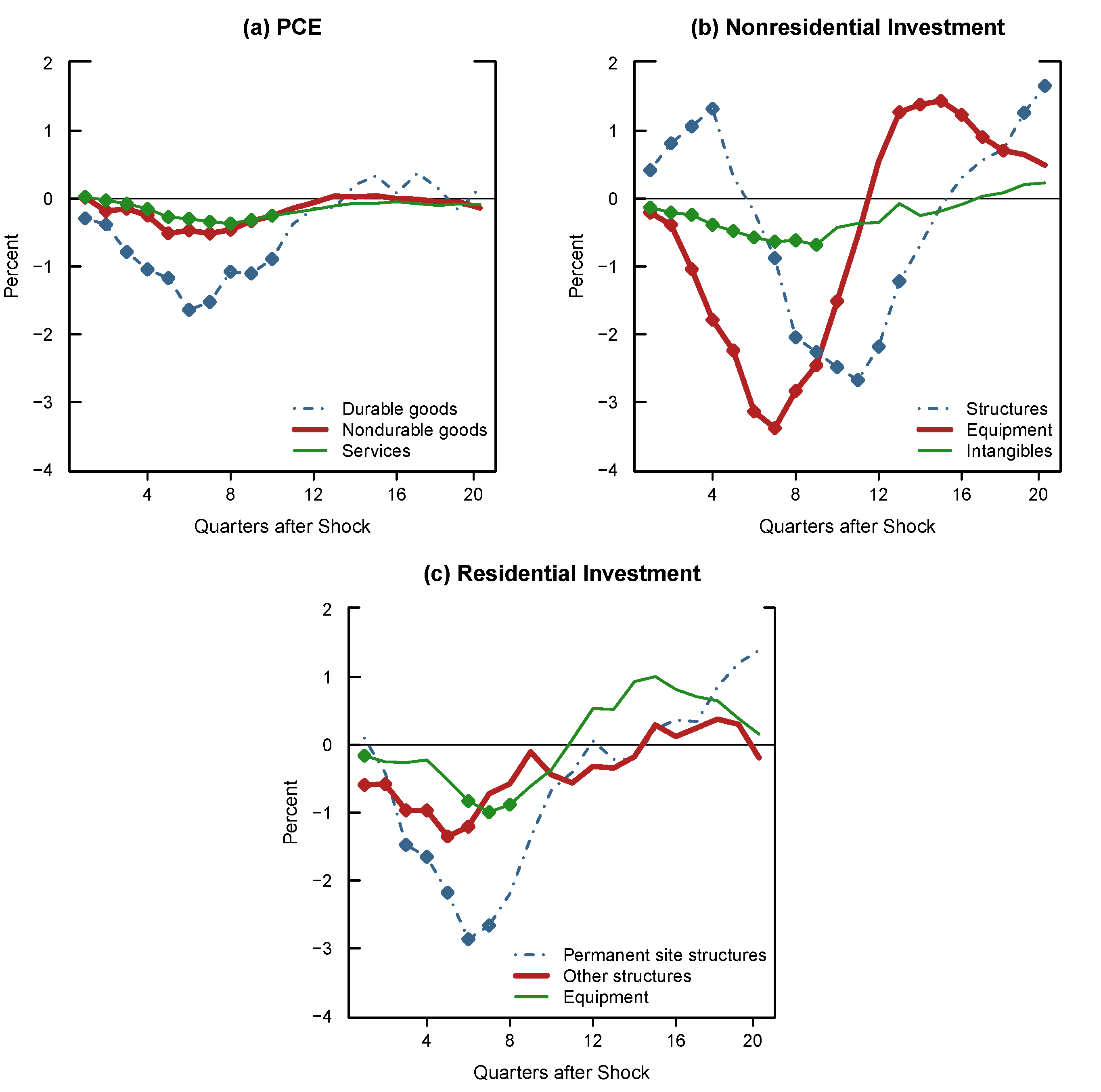 Note: The figure shows the estimated impulse responses of real growth for various PDFP sectors to a one standard-deviation bank credit supply shock. Panel (a) shows the responses of personal consumption expenditure on durable goods (the blue dashed-and-dotted line) line), nondurable goods (the red line), and services (the green line). Panel (b) plots the responses of nonresidential investment in structures (the blue dashed-and-dotted line), equipment (the red line), and intangibles (the green line). Panel (c) shows the responses of residential investment in permanent site structures (the blue dashed-and-dotted line), other structures (the red line), and equipment (the green line). Diamonds denote the point estimates of the impulse responses that are statistically significant at the 68 percent confidence level.