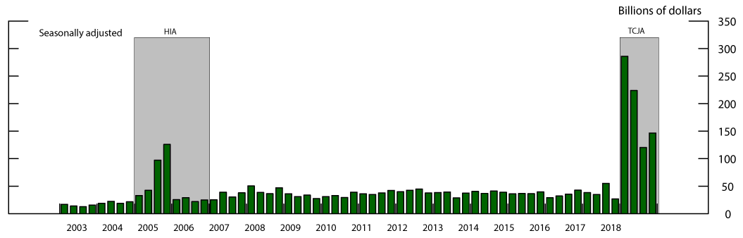 Note: Homeland Investment Act (HIA) shaded area extends from 2005:Q1 to 2006:Q4. Tax Cuts and Jobs Act (TCJA) shaded area extends from 2018:Q1 to 2018:Q4.
