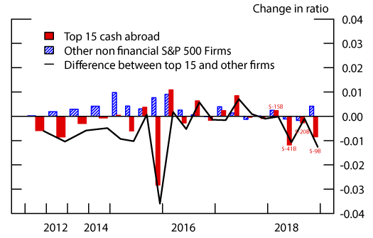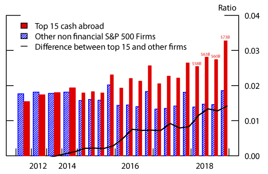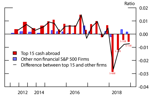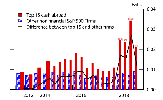 2. Cash held abroad is estimated by Board staff based on Bloomberg data for nonfinancial S&P 500 firms and refers to cash and cash equivalents, which include both cash and liquid assets held abroad and excludes overseas profits that are permanently reinvested in the companies' overseas operations. Estimates suggest that most of the cash held abroad is invested in dollar-denominated fixed-income assets (see Pozsar (2018)). Return to text