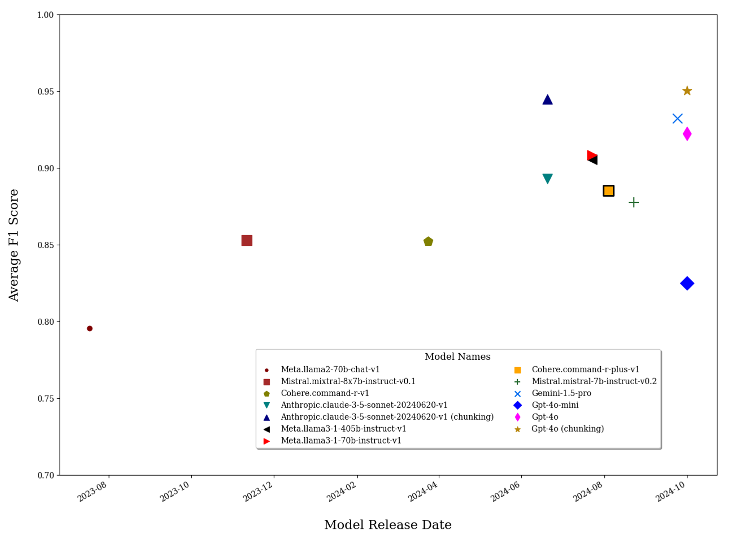Variation in the performance of different models was loosely correlated with their release dates. To illustrate this pattern, Figure 1 depicts the month and year of release for each of the models we evaluated on the x-axis and their average F1-score on the y-axis. We see notable improvements in the performance of models released in more recent months. Focusing on the generative AI models by Meta in our evaluation set, we see that average F1-scores between Llama2 and Llama3 versions improved markedly, from 0.80 to 0.91 percent. However, that is not to say that newer releases always dominate; indeed, as shown by the chunking approach to prompts described earlier, modest changes in the methods used to interact with generative AI models can lead to substantial differences in the outputs and the models' comparative performance.