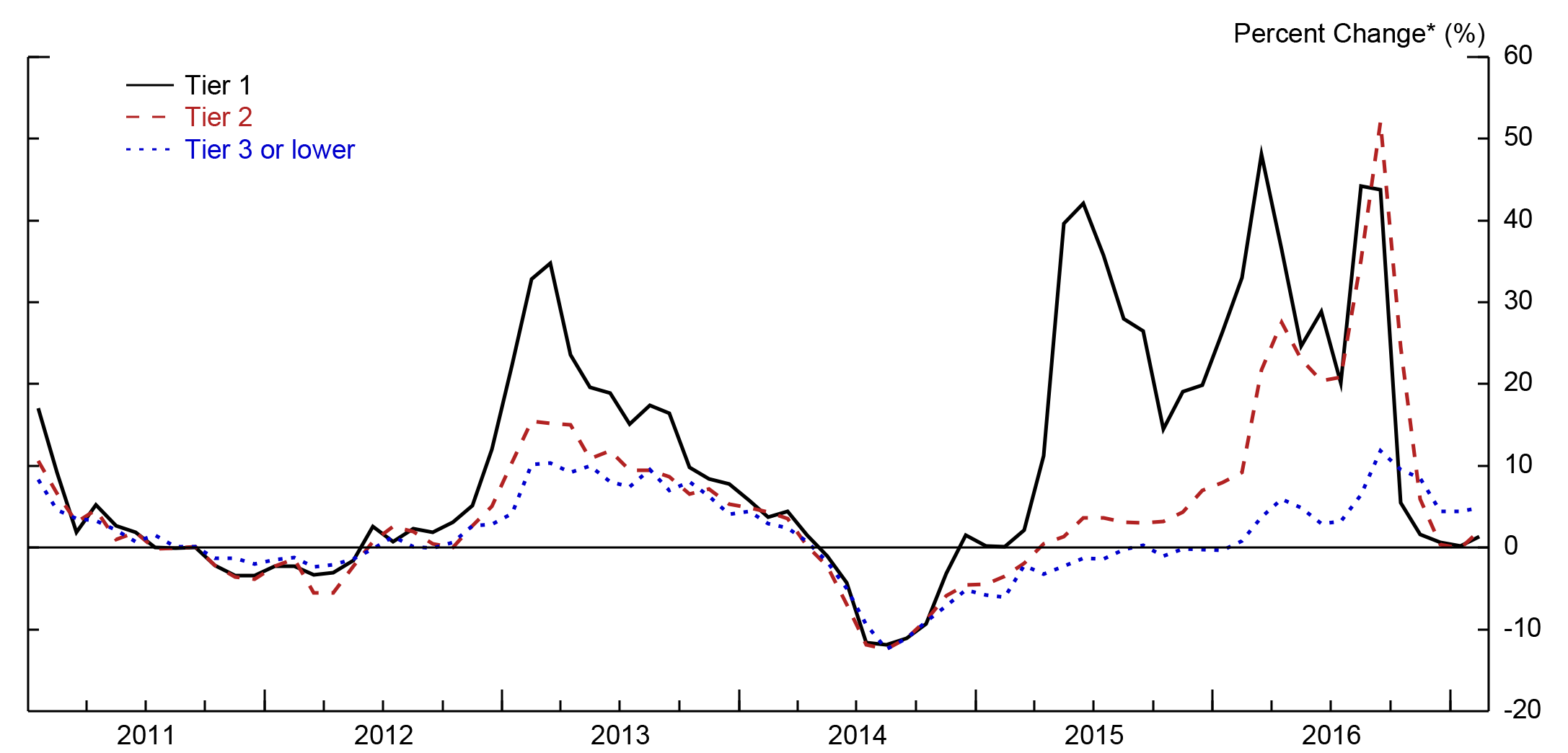 There are significant fluctuations in real estate prices over time and across regions in China (Figure 1.). Average real estate prices in tier 3 cities have gyrated over the last six years, whereas average real estate prices in tier 1 cities have skyrocketed. Between December 2010 and February 2017, prices for tier 1 cities increased 77 percent, and prices for tier 2 cities increased 30 percent. Meanwhile, prices for tier 3 cities have increased only 8 percent.