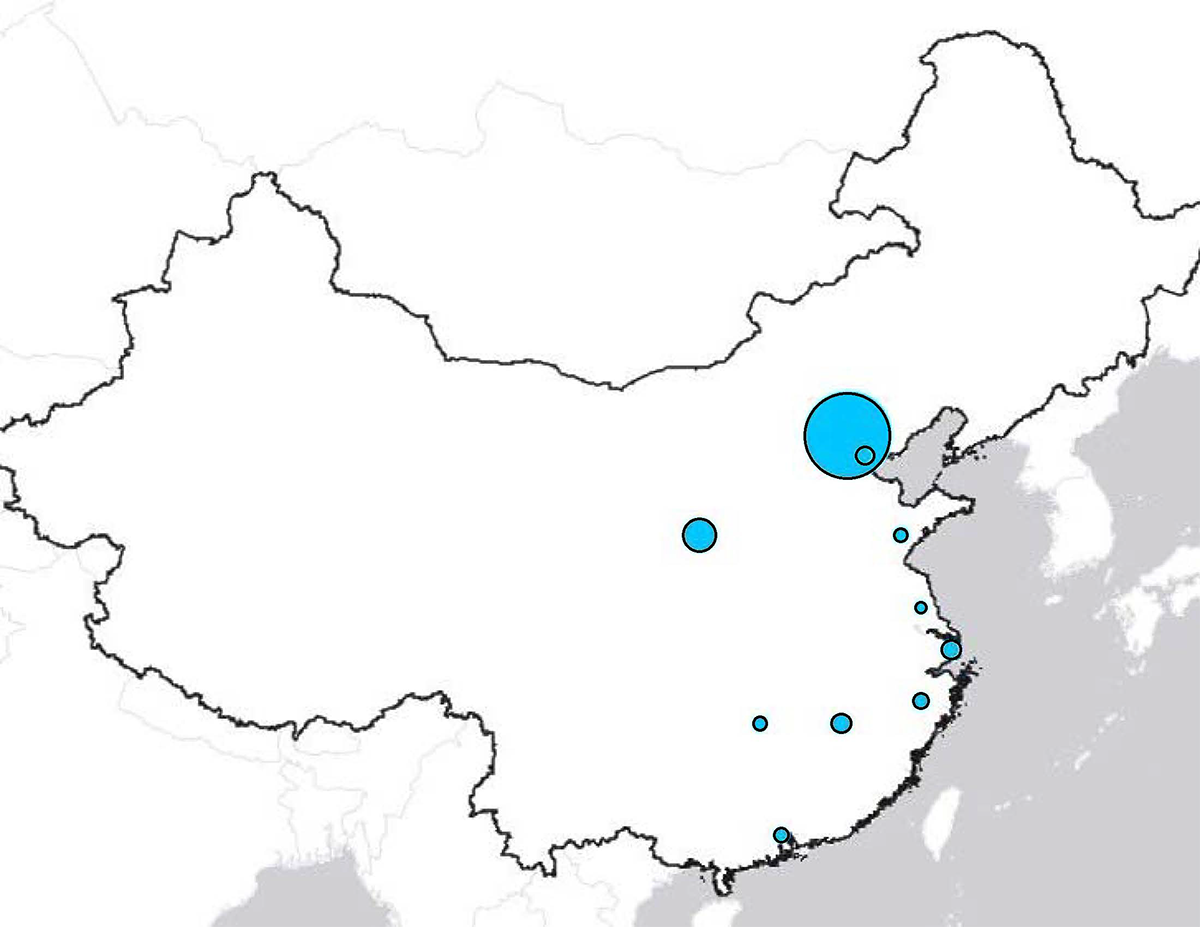 This graph shows the distribution of Bank of Beijing's branches across China, with larger circles representing a larger portion of the bank's branches being located in a given province.