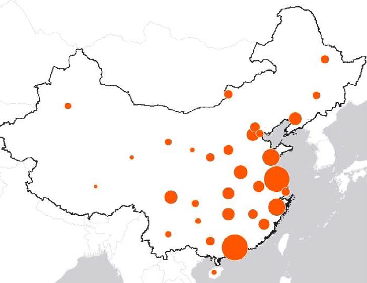 This graph shows the distribution of Bank of China's branches across China, with larger circles representing a larger portion of the bank's branches being located in a given province.