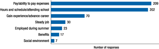According to the Survey of Young Workers, 66 percent of respondents are somewhat satisfied or very satisfied with their job arrangements over the past five years (figure 8). The satisfaction of these respondents is attributed to their compensation and their schedule (figure 9). For example, one respondent stated, "my jobs had decent hours, decent pay, and I was never involuntarily unemployed." Another stated, "I got experience that I can utilize in other fields/jobs, and the payment I received helped me get through that certain [sic] time."