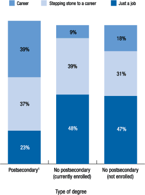 Working respondents who lack postsecondary degrees have less upward mobility through a career. For example, those without a postsecondary degree and who are not currently enrolled in school are more likely to have a job (47 percent) and less likely to have a career (18 percent).