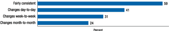 A consistent schedule is associated with greater job satisfaction (figure 13). For example, 59 percent of workers with a consistent schedule are satisfied with their current job arrangements while only 24 percent of workers with a schedule that changes month-to-month are satisfied with their current job arrangements.