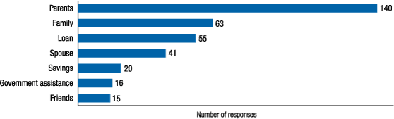 Those who are not able to cover their monthly household expenses were asked to describe, in their own words, "how they make ends meet." The largest number of respondents, 140, noted that they rely on their parents for assistance, while 63 respondents receive assistance from family members (without specifying parents) (figure 15). Fifty-five respondents reported that they take out loans of some nature, while a few reported that they rely on savings (20) or government assistance (16).