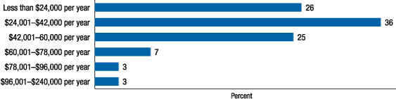 In the survey, 28 percent of respondents with a paid job are working only one part-time job. An additional 8 percent of the working respondents have two or more part-time jobs. Respondents with part-time jobs average 22 hours of work per week.30 The distribution of hours worked is broadly laid out between 0 and 40 hours with no real central tendency.