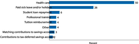 In the survey, 41 percent of working respondents are satisfied with the benefits they currently receive from their employer, while 27 percent of working respondents are not satisfied with their current benefits. Twenty-nine percent are neither satisfied nor dissatisfied with their benefits. Respondents identified health care as the most important benefit to receive from an employer (figure 17). Seventy percent of these respondents have access to health care, and 65 percent of the working respondents have access to health care through their job. Finally, working respondents reported that paid sick leave or holidays is the second most important benefit to receive from their job. Fifty-three percent of working respondents currently have paid sick leave.