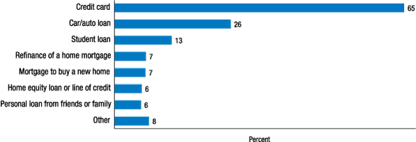 The survey also inquires about respondents' demand for credit in the past year. Thirty-seven percent of respondents applied for some type of credit in the prior 12 months, up from 31 percent in the 2013 survey. Among those who applied for credit, credit cards and auto loans were the most common application types, with 65 percent reporting that they applied for a credit card and 26 percent reporting that they applied for an auto loan (figure 12).