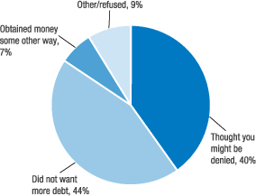 The survey also asks respondents who did not apply for credit whether they desired credit but chose not to submit an application. Twelve percent of respondents who did not submit a credit application in the past year report that they had a desire for additional credit. When asked why they did not act on their desire for credit by submitting an application, these respondents were closely split between thinking that their application would be denied and simply not wanting to take on more debt (figure 13).