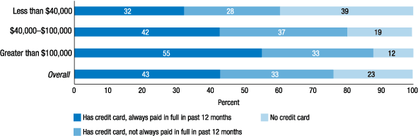 As was the case for mortgage credit, access to a credit card differs substantially by income. Only 60 percent of respondents with incomes under $40,000 per year have at least one credit card, approximately 20 percentage points lower than that seen for respondents making between $40,000 and $100,000 per year (figure 15). However, among respondents with a credit card, those with incomes below $40,000 were just as likely as those making between $40,000 and $100,000 to pay their bills in full each month. In each of these income groups, 53 percent of respondents with a credit card always pay their bill in full--which is 10 percentage points lower than that seen for the highest income group.