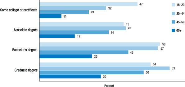 According to the survey, 27 percent of respondents borrowed money to pay for expenses related to their own education, including 15 percent who currently owe money on these loans and 11 percent who borrowed money that they have since repaid. Among just those who completed at least some education beyond high school, 39 percent acquired at least some debt to finance that education, and among those who completed at least a bachelor's degree, 49 percent acquired at least some debt in the process. Reflecting the increased use of student loans among more recent cohorts of college attendees, respondents under age 45 are more likely to have taken out loans for their education for each level of education obtained (figure 16).
