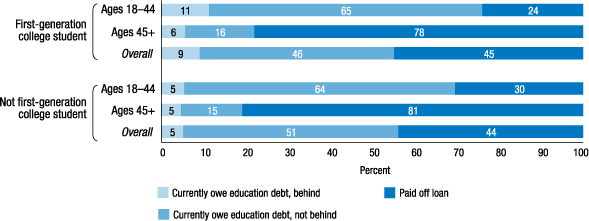 Consistent with their lower completion rates, first-generation college students who took out a student loan for their education are disproportionately likely to report being behind on their payments. Among respondents under age 45, first-generation college students who borrowed are more than twice as likely to be behind on their payments as borrowers with