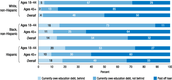 Return to textSimilar differences also emerge by the race and ethnicity of respondents. Nearly half of white respondents in the survey who attended college completed at least a bachelor's degree, whereas only 40 percent of black respondents and 30 percent of Hispanic respondents did so. Black and Hispanic borrowers are also much more likely than white borrowers to be behind on their loan, and are less likely to have completely repaid their loan (figure 18). The divergence of student loan repayment rates by race/ethnicity suggests that the burden of unmanageable student loan debt may be of greater concern among minority students than it is for white students. This too may be the result of either differences across races and ethnicities in respondents' socioeconomic or educational backgrounds, in their postsecondary educational experiences, or in the wages received for a given credential that then influence their ability to repay student loans.