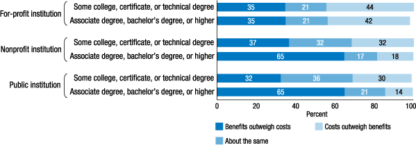The more education that respondents completed, the more likely they are to indicate that the benefits of their undergraduate education exceed the costs. Among individuals with some education beyond high school but who did not complete at least an associate degree, just 33 percent say that the financial benefits of that education exceed the costs, while 30 percent say that the costs outweighed the benefits. However, 43 percent of those completing an associate degree, 61 percent of those completing a bachelor's degree, and 80 percent of those completing a graduate degree indicate that the financial benefits of their undergraduate education exceed the costs. (Just over 75 percent of respondents who have a graduate degree also say that the lifetime financial benefits of their graduate degree exceed the costs.)