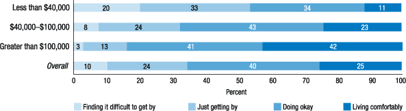 Return to textPerceptions of overall economic well-being are closely linked to household income. Among respondents in households making less than $40,000 per year, 53 percent indicate that they are either finding it difficult to get by or are just getting by.4 This fraction changes inversely with income, with just 16 percent of those earning more than $100,000 reporting the same.