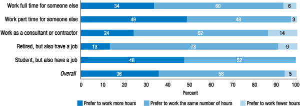 Figure 2. Would you prefer to work more, less, or about the same amount as you currently work at your current wage? (by employment status)